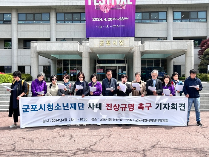 ▲ 군포시민단체협의회가 4월 17일 오전 군포시청 앞에서 연이어 자살사망한 군포시청소년재단 직원 관련 진상조사와 재발 방지 대책을 촉구하는 기자회견을 가졌다.